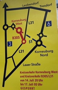 Wir möchten Sie gerne über eventuelle Hindernisse bei der Anfahrt zu uns informieren: "Korneuburg - Sperre Kreisverkehr West und Kreisverkehr B305/L31"