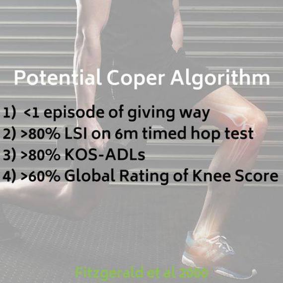ACL-Verletzungen (mit Ausnahme von begleitenden Verletzungen des Knorpel in seiner vollen Dicke und von komplexen Meniskusrissen) sollten untersucht werden, um festzustellen, ob die Person ein "potenzieller Coper" sein kann und anschließend als erste Behandlungsoption eine konservative Rehabilitation angeboten werden.