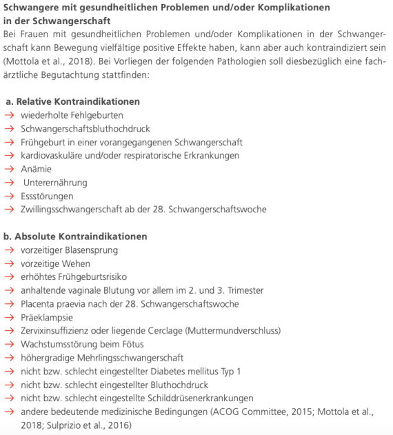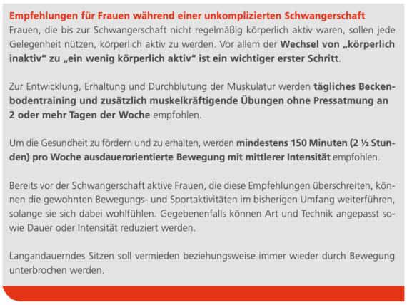 Die im Jahr 2020 aktualisierten Österreichischen Empfehlungen für gesundheitswirksame Bewegung beschreiben, in welchem Ausmaß körperliche Aktivität der Gesundheit nutzt und in welcher Dauer und Intensität diese auszuführen ist. Es werden konkrete Bewegungsempfehlungen für unterschiedliche Zielgruppen gegeben. Für FRAUEN WÄHREND DER SCHWANGERSCHAFT ab Seite 61: