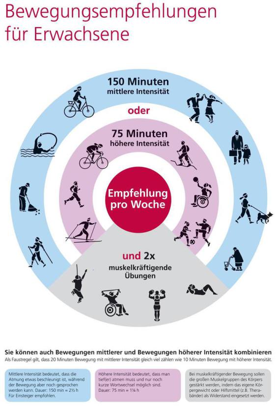 Hierzu auch die Bewegungsempfehlungen des Fonds Gesundes Österreich bzw. der WHO (siehe Bild)