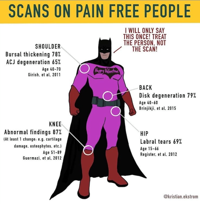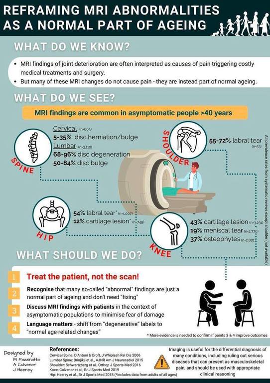 Erkenne, dass viele sogenannte "abnormale" Befunde nur ein normaler Teil des Alterns sind und keine "Korrektur" benötigen. Das kann die Angst vor Schäden bei den Betroffenen minimieren. Veränderungen sind natürlich und ein Teil des Lebens. Und auch schmerzfreie Personen können