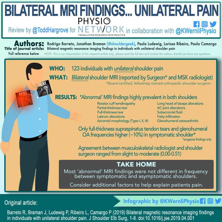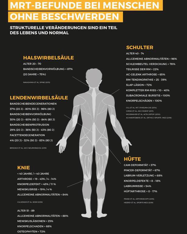So ist beispielsweise die Häufigkeit von MRT-Auffälligkeiten zwischen symptomatischen und asymptomatischen Schultern kaum unterschiedlich (Barreto et al., 2019)