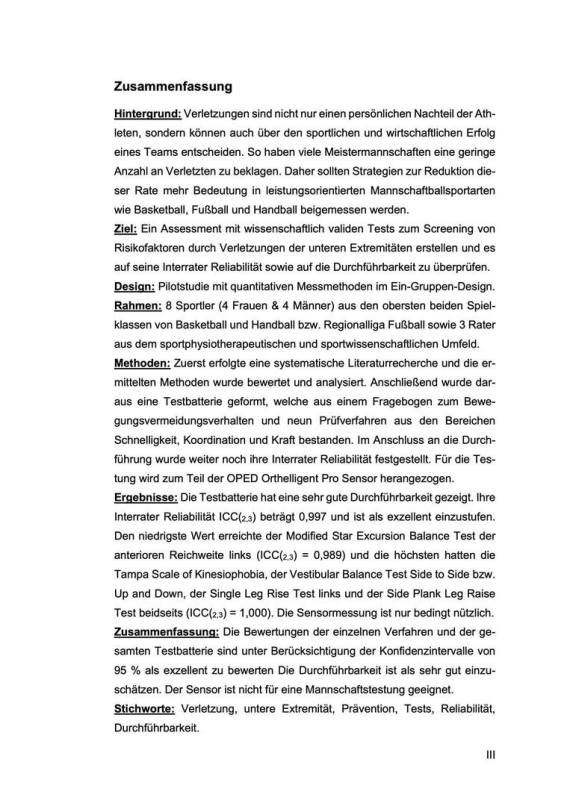 Unsere Studie zum Thema "Valide Tests zur Erstellung eines Assessments zum Screening für Risikofaktoren von Verletzungen der unteren Extremität in Mannschaftsballsportarten" ist nun fertiggestellt. Außerdem waren weitere Fragen, wie hoch die Interrater Reliabilität des gesamten Assessments im sportphysiotherapeutischen und sportwissenschaftlichen Umfeld bzw. wie die Durchführbarkeit einer solchen Testbatterie einzuschätzen ist?