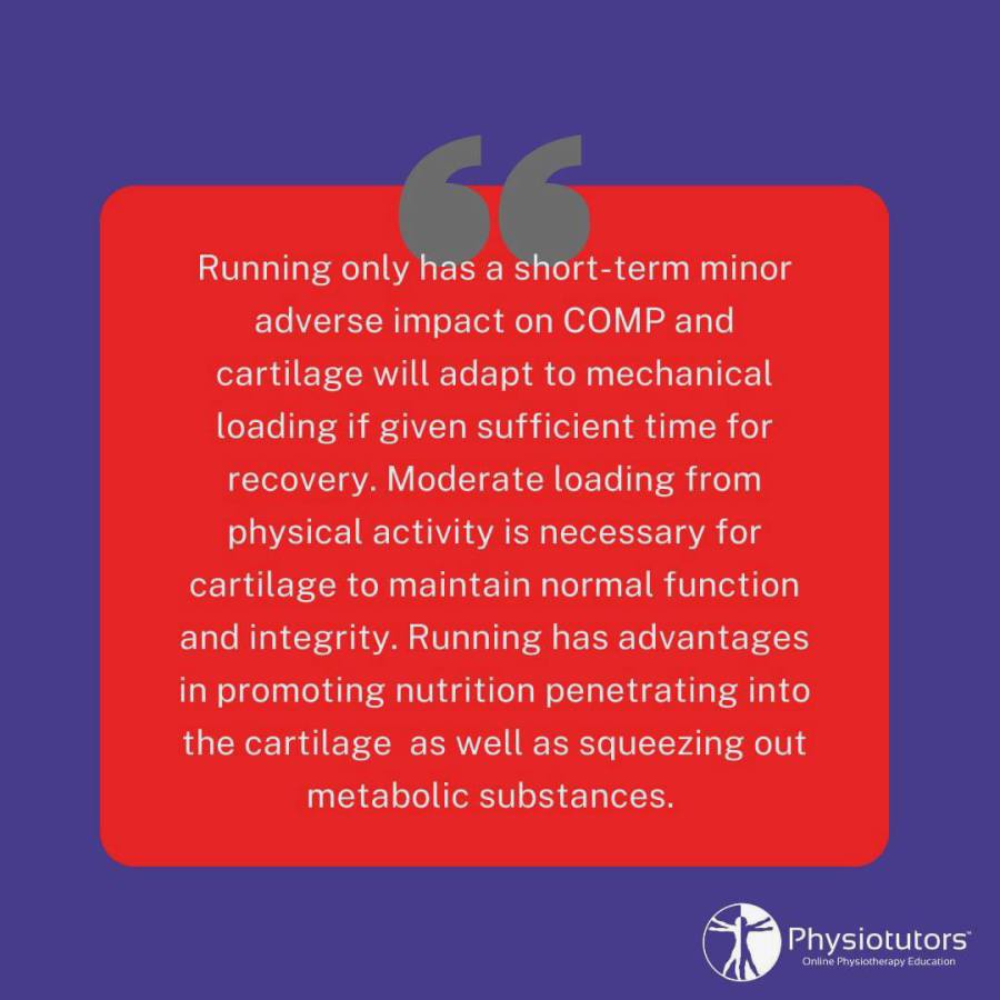 Das Laufen hat nur kurzfristig geringfügige nachteilige Auswirkungen auf das Cartilage Oligomeric Matrix Protein (COMP) und der Knorpel passt sich der mechanischen Belastung an, wenn genügend Zeit für die Erholung zur Verfügung steht. Eine mäßige Belastung durch körperliche Aktivität ist erforderlich, damit der Knorpel seine normale Funktion und Integrität beibehält. Laufen hat Vorteile bei der Förderung des Eindringens von Nahrung in den Knorpel sowie beim Herausdrücken von Stoffwechselsubstanzen (Dong et al., 2020).