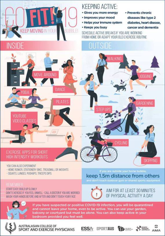In dieser sich schnell verändernden Landschaft stehen Patienten, ihre Allgemeinmediziner, Spezialisten und Gesundheitsorganisationen plötzlich vor der Notwendigkeit, Patienten bei der Anpassung an das Training unter diesen restriktiven Bedingungen zu unterstützen. Das Australasian College of Sport and Exercise Physicians hat in Zusammenarbeit mit Exercise and Sports Science Australia, der Australian Physiotherapy Association, der Sports Medicine Australia, der Australian Medical Association und Sport Australia ein Infografik-Toolkit entwickelt, das bei der Verschreibung von Übungen während der Pandemie hilft. Das Kit enthält drei Ratschläge für Kinder, Jugendliche und die erwachsene Bevölkerung.