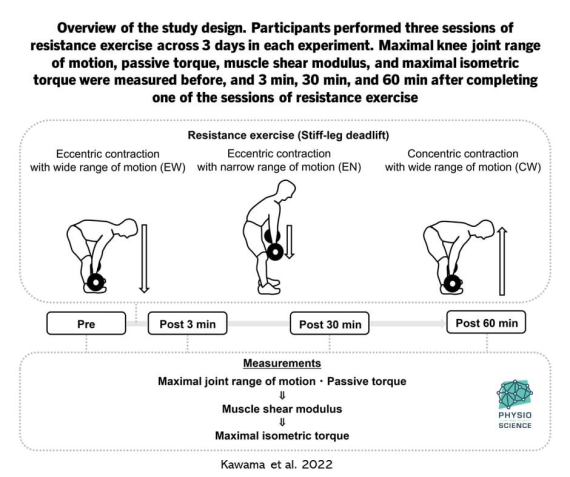 Aktuelle Studien weisen auf die interessante Möglichkeit hin, dass Widerstandsübungen ebenso wie Dehnübungen die passive Muskelsteifheit verringern. Es ist jedoch wenig darüber bekannt, wie Programmvariablen des Widerstandstrainings die Muskelsteifheit akut beeinflussen. Kawama et al. Ziel war es, die akuten Veränderungen der passiven Steifheit der einzelnen Oberschenkelmuskeln nach Widerstandsübungen mit verschiedenen Kombinationen von Kontraktionsmodi und Bewegungsbereichen (ROMs) zu untersuchen.